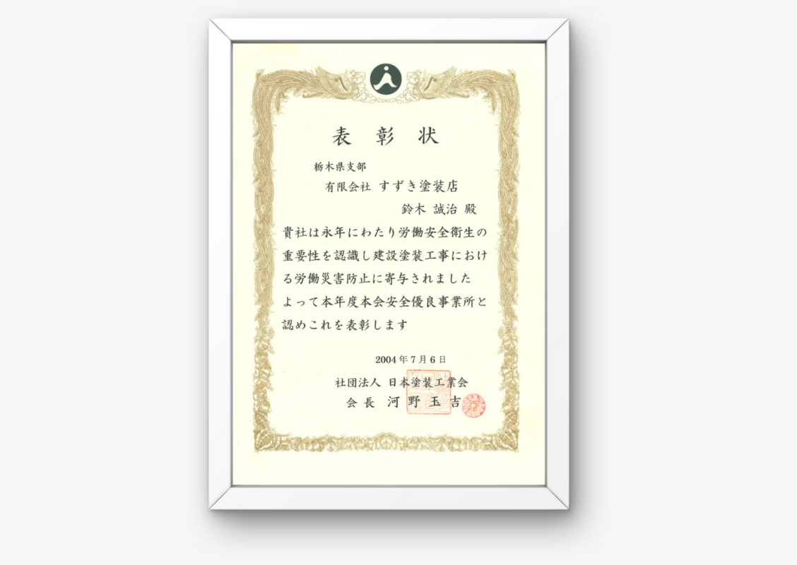 日本塗装工業会からの表彰状(2004年度)