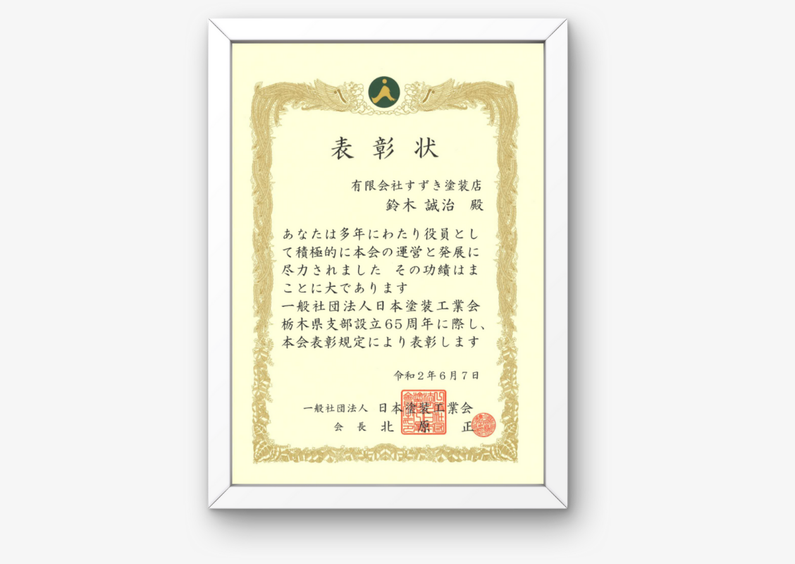 日本塗装工業会からの表彰状(令和2年度)