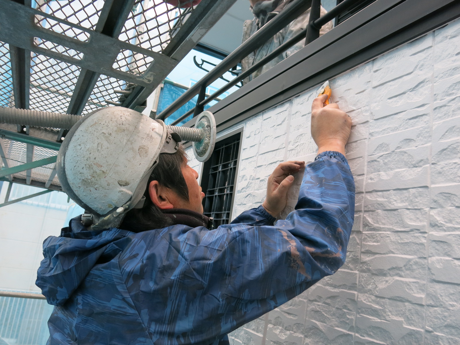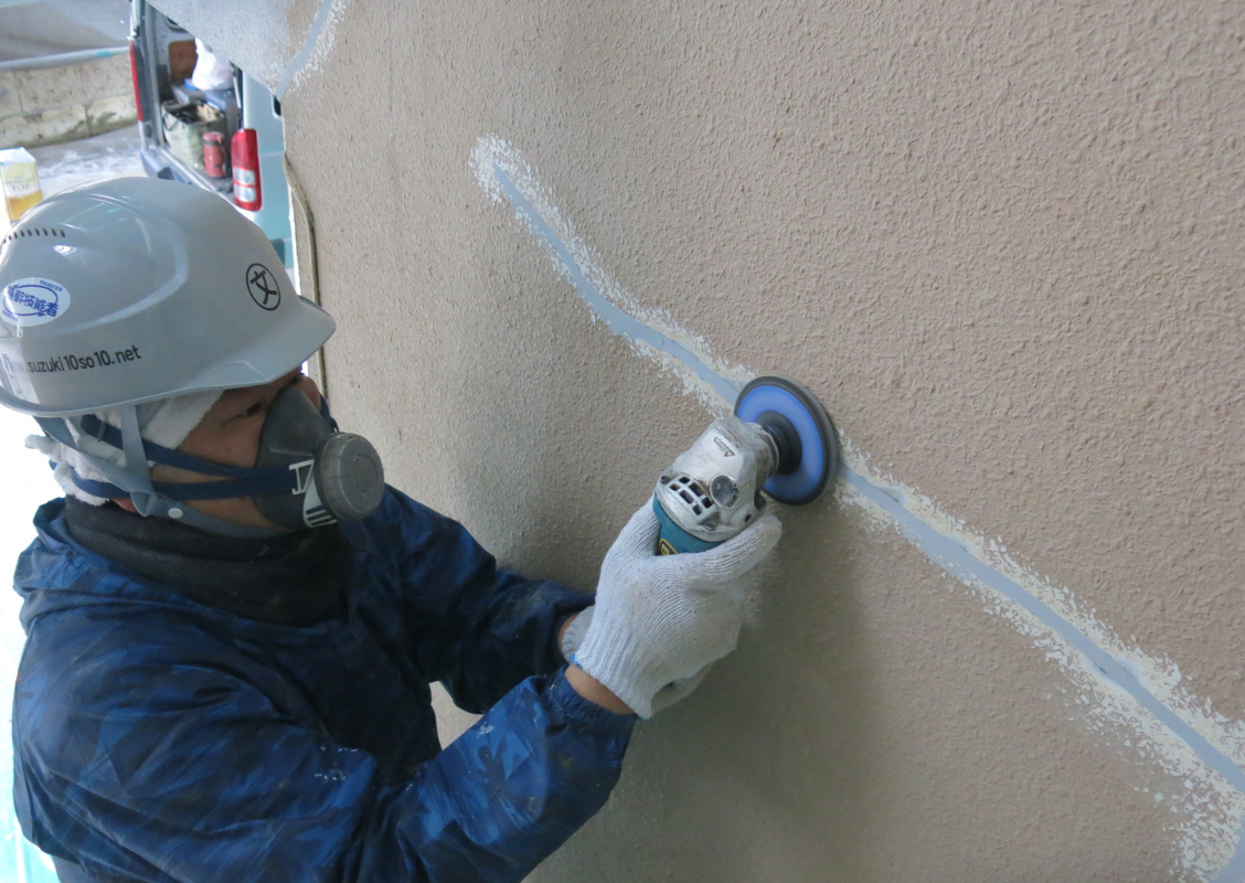 外壁壁のひび割れの補修や、鉄部のケレン、サビ止めを行います。ケレンとは塗装面から、旧塗膜を剥がしたり、地ならしする作業です。その後に錆止めを塗ります。