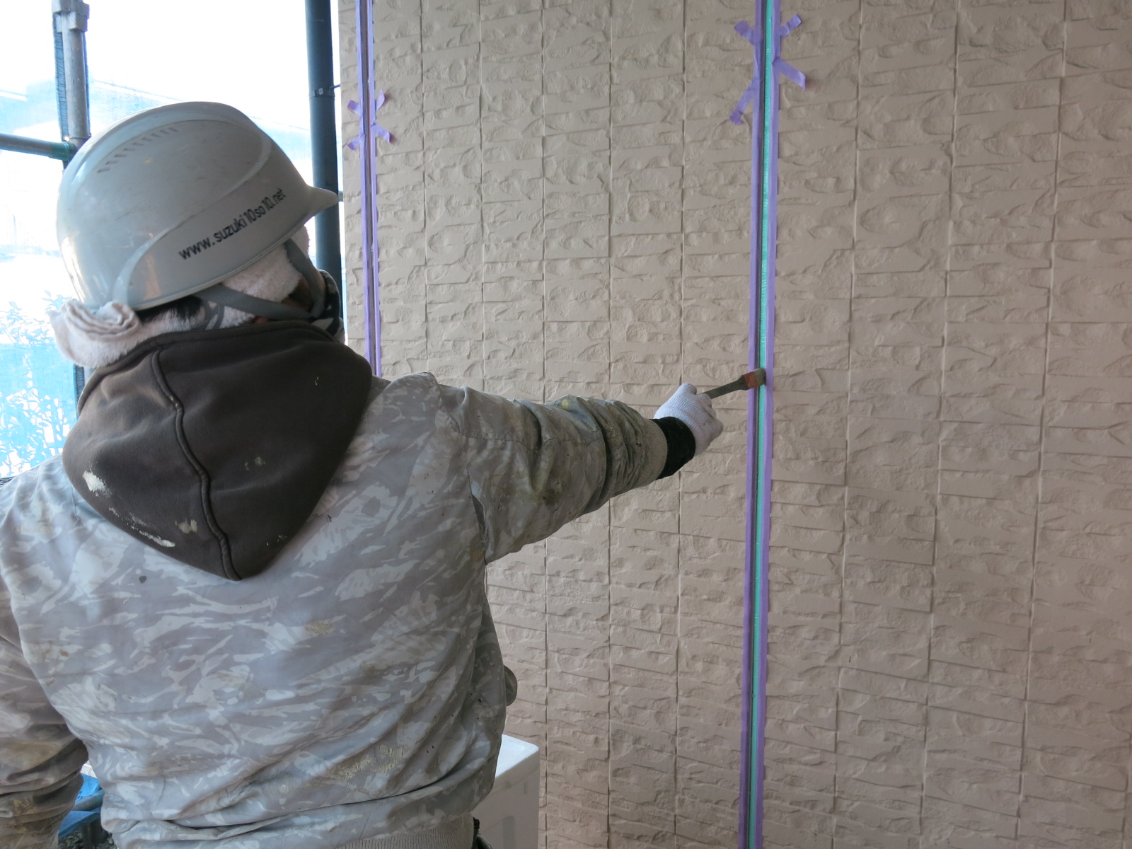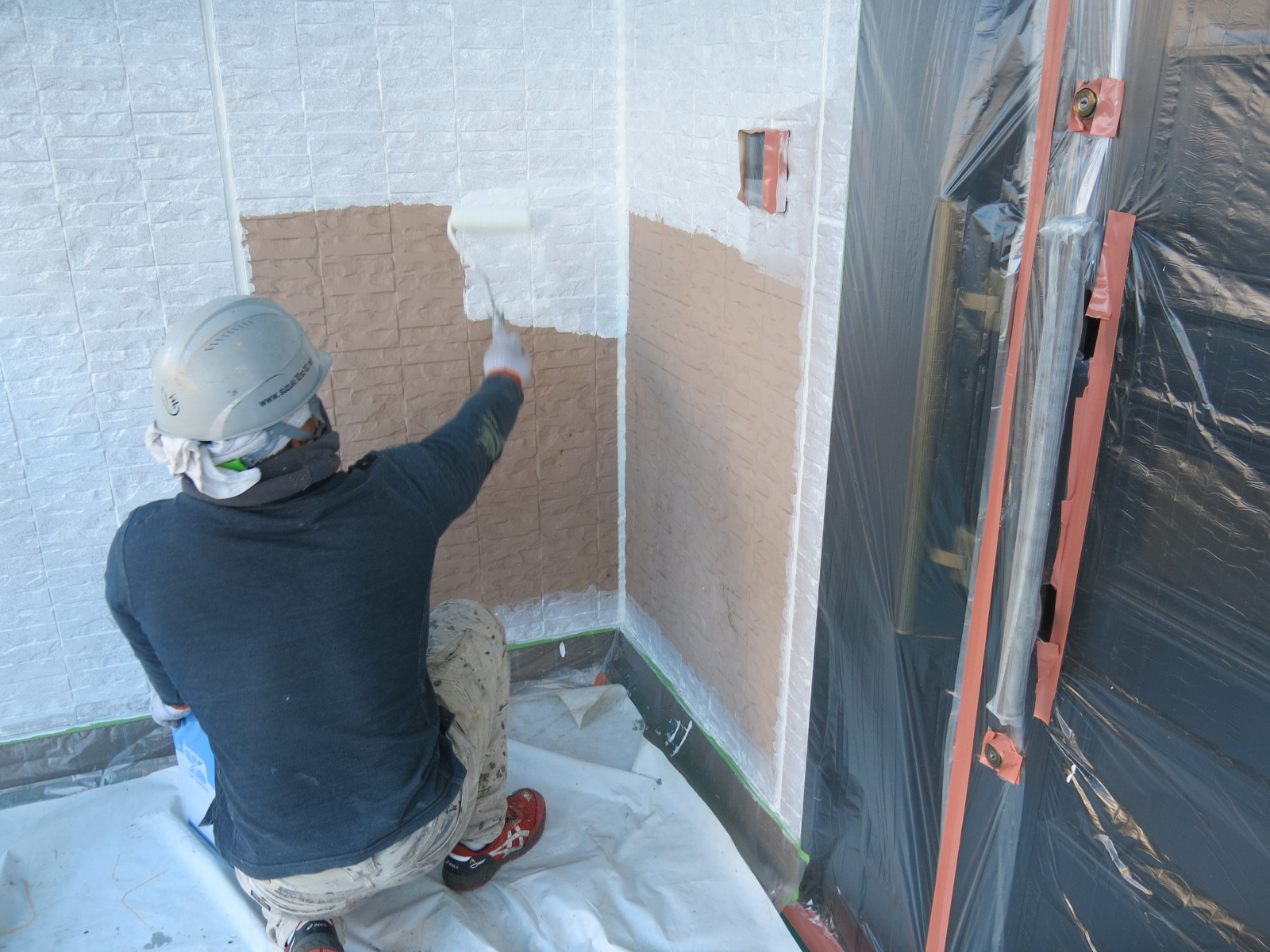 また、モルタル壁の場合には、細かいヒビ割れを埋め、上塗り塗料の吸い込みを防ぎ、仕上がりをよくするために厚膜の下地強化剤を使用する、等と言った感じです。