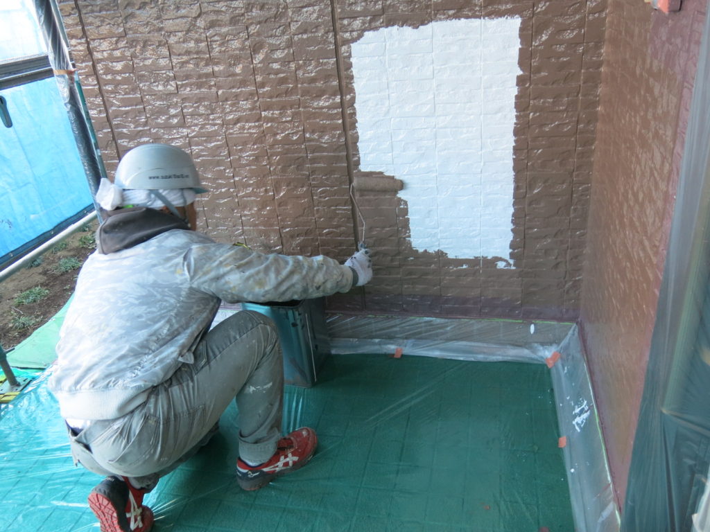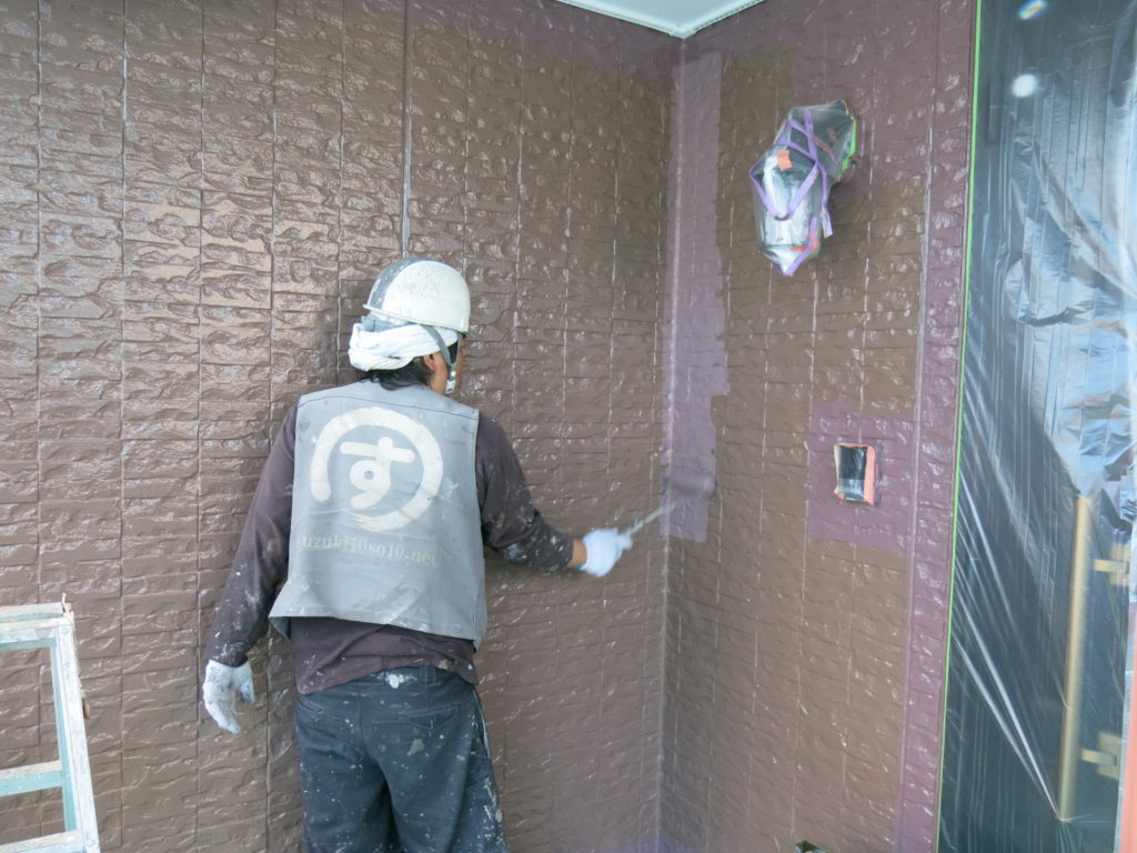 まずは下塗り。これは壁面と塗料をしっかりと付ける役割がある大切な工程です。壁面によって、それぞれに合った「下地強化材」を使用するのがポイントです。