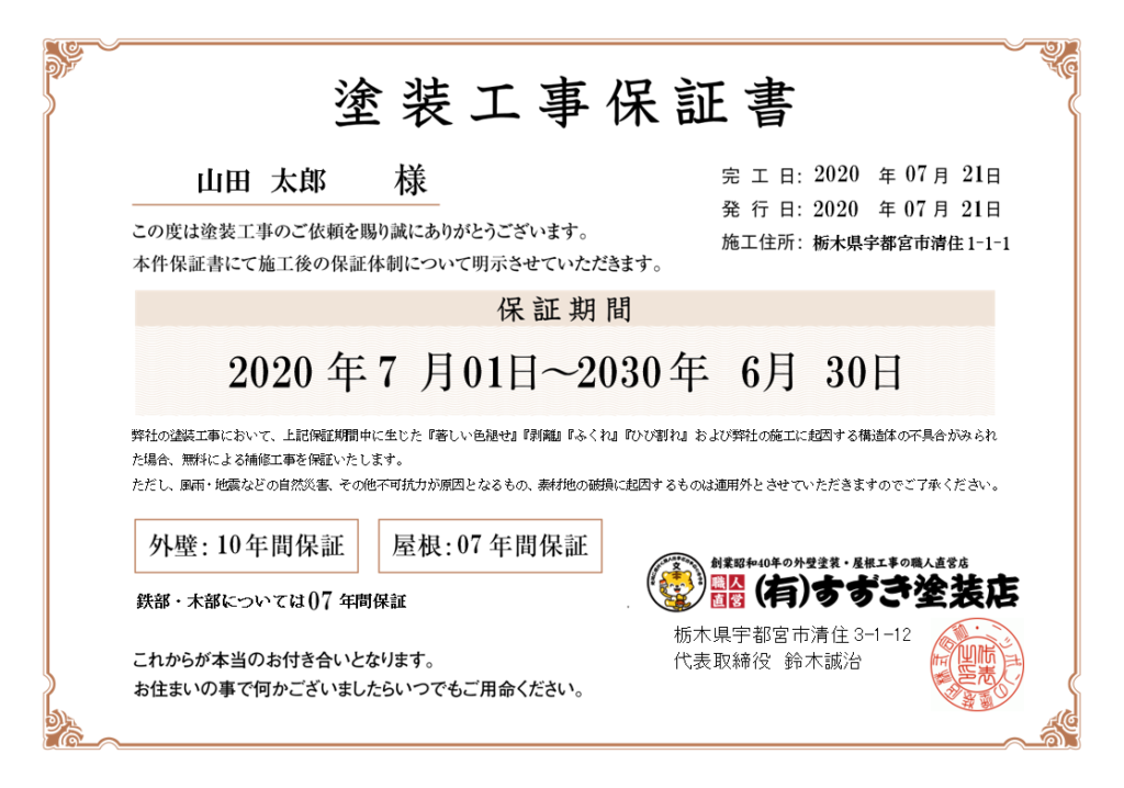 ※保証書を発行する際には、実際の使用塗料・下地状態に応じた内容で記載いたします。